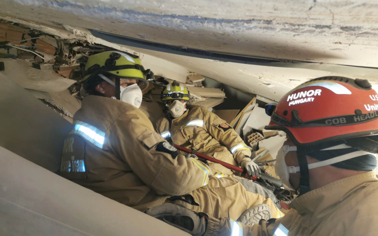 A HUNOR mentőcsapat a mai napon is folytatta a mentési munkálatokat, egy, a kutyák által jelzett túlélő után kutattak egy többemeletes épület alsó szintjén.